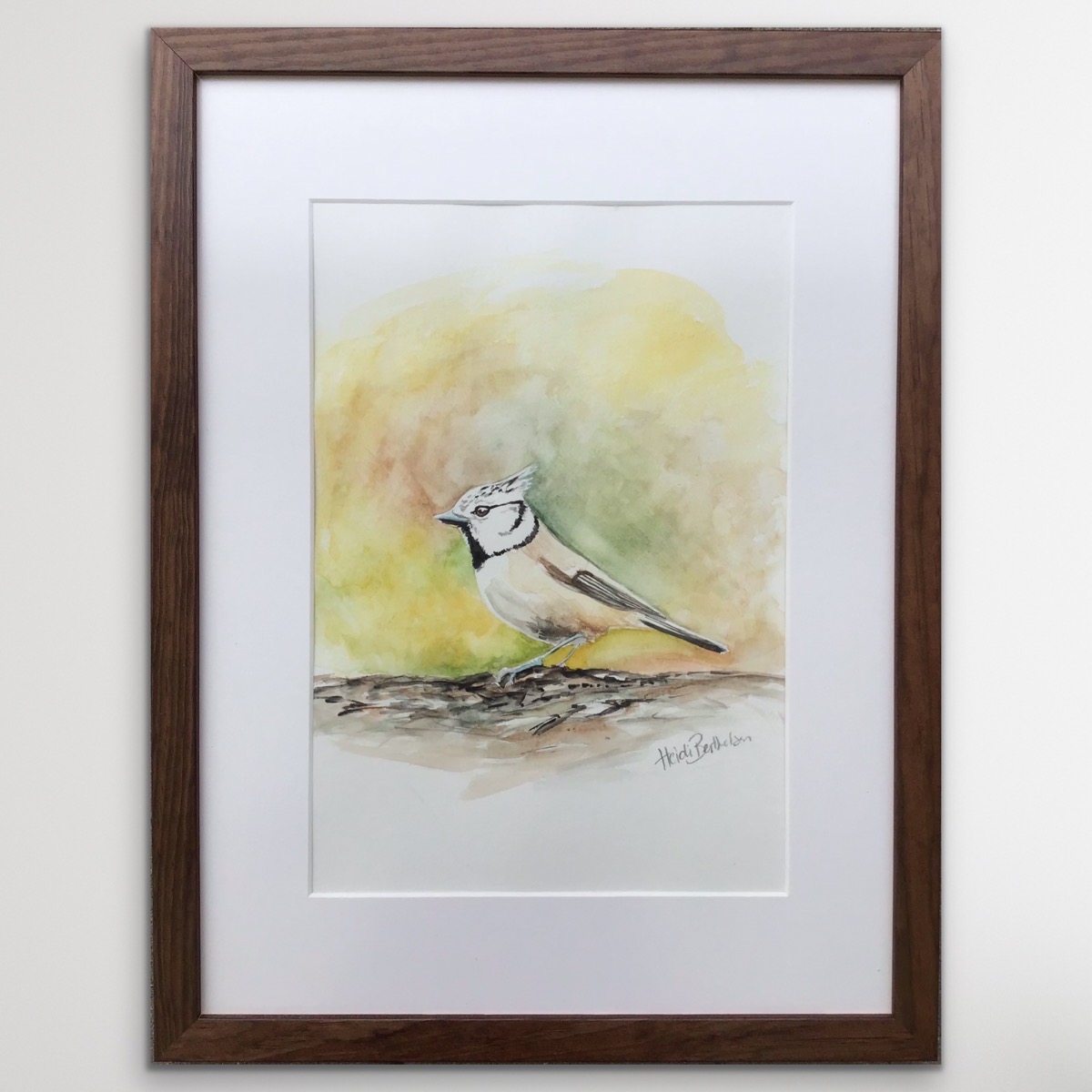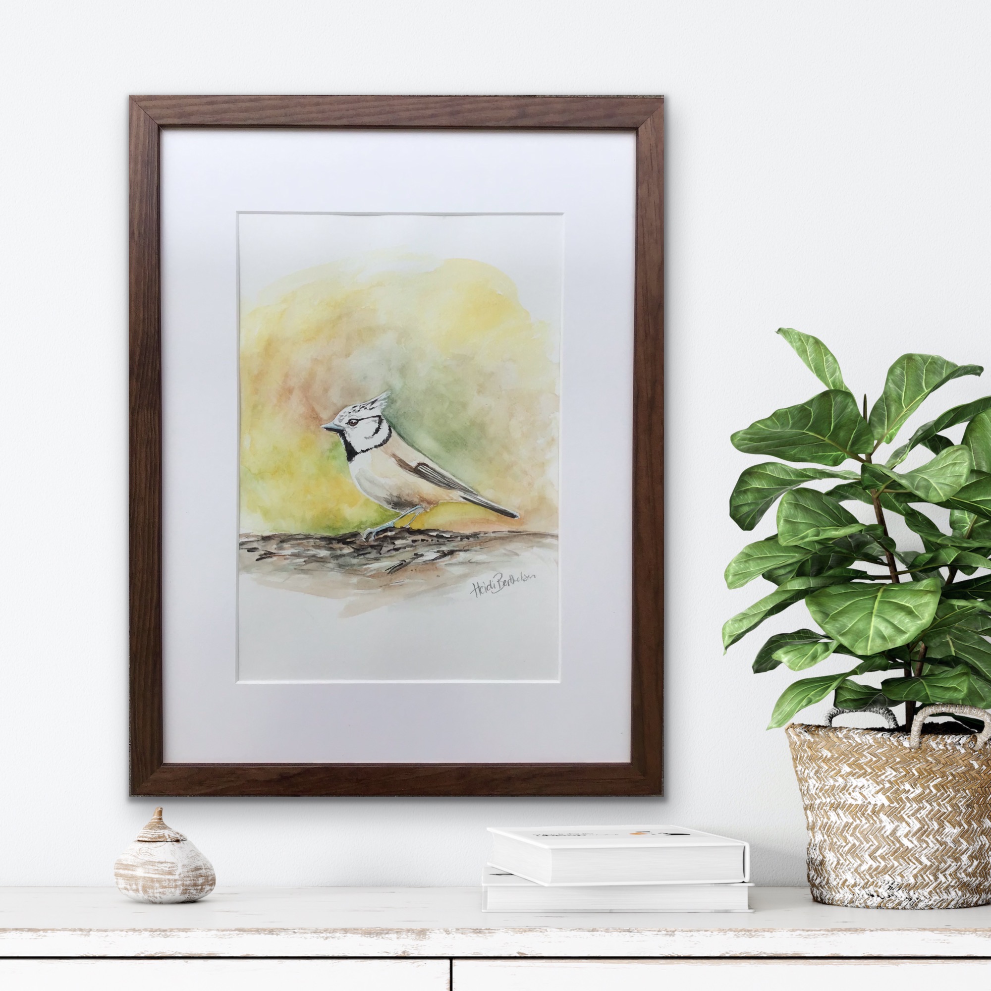 Et naturalistisk maleri der viser hvad akvarel kan med stor præcision og fine pensler. Topmejsen er en af de sød lille fugle, hvor man bliver glad hvis man ser en på sin vej.