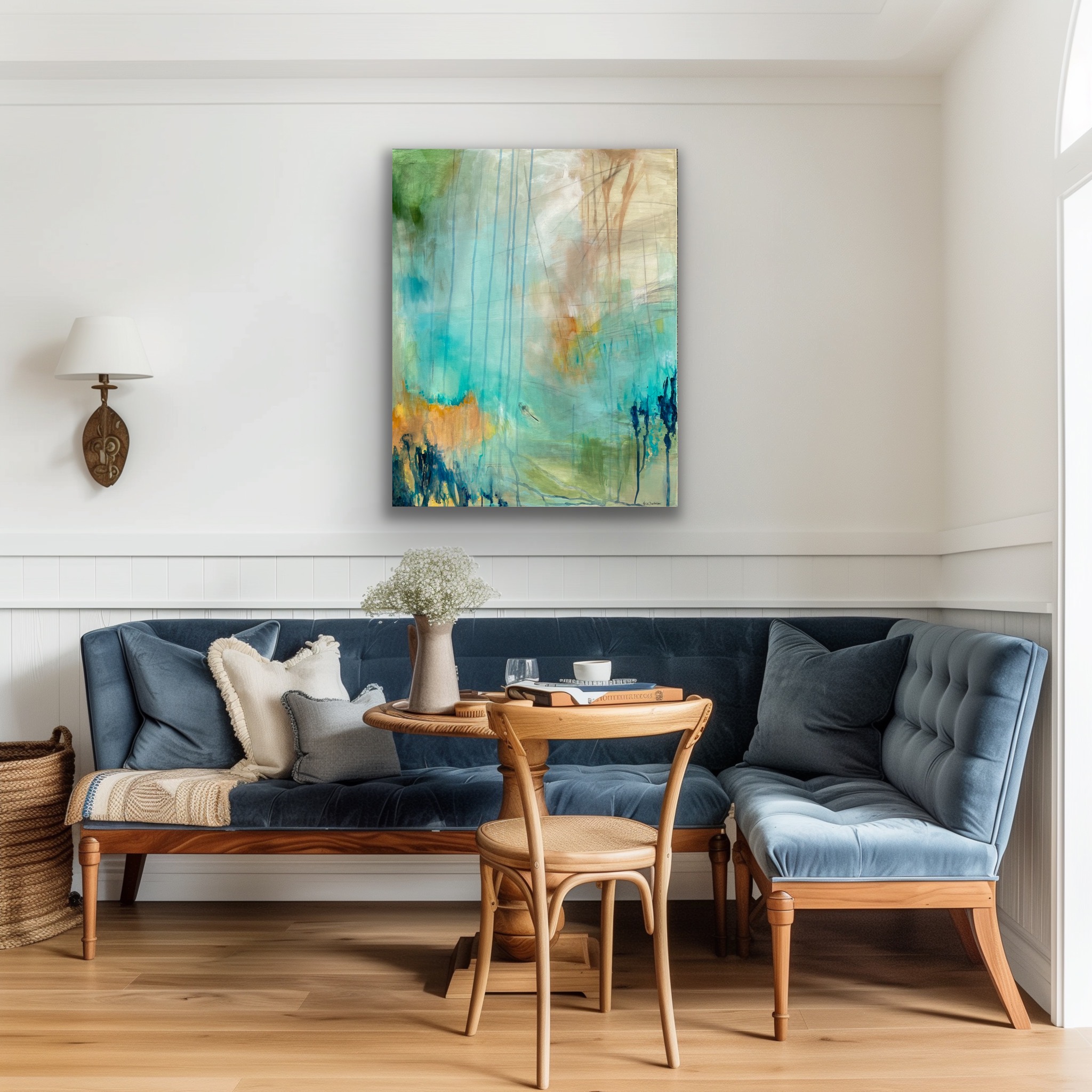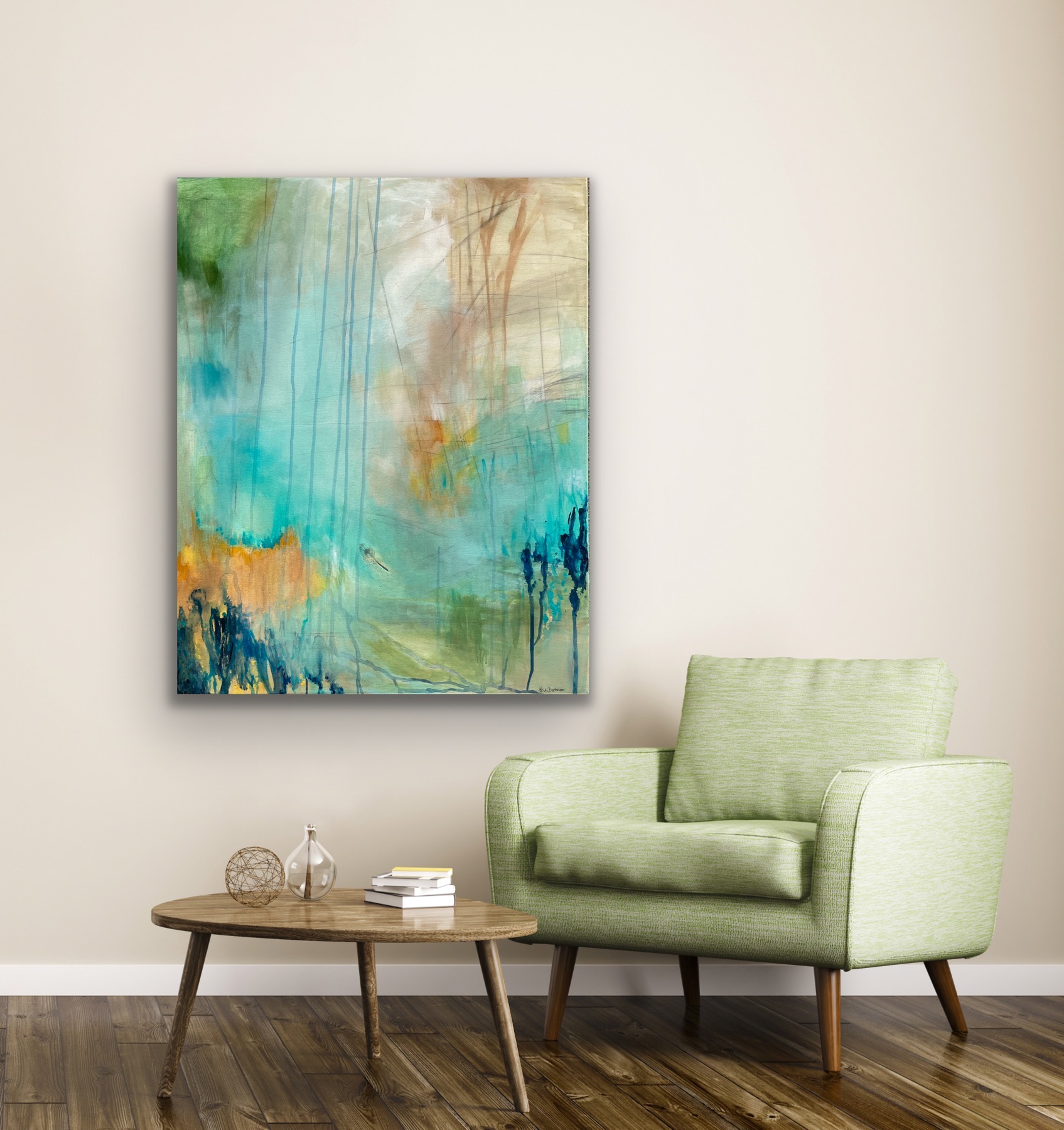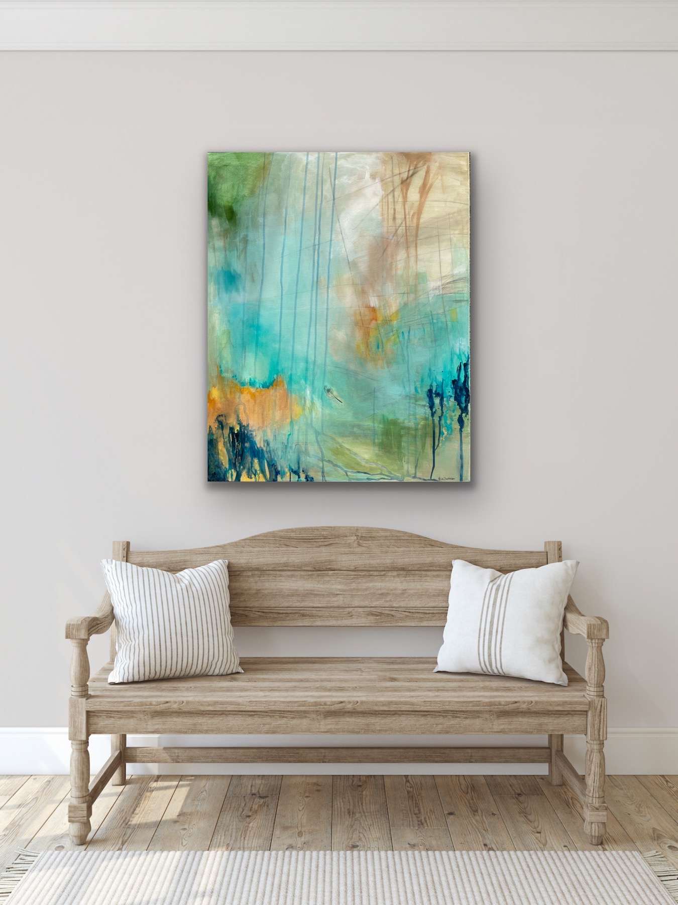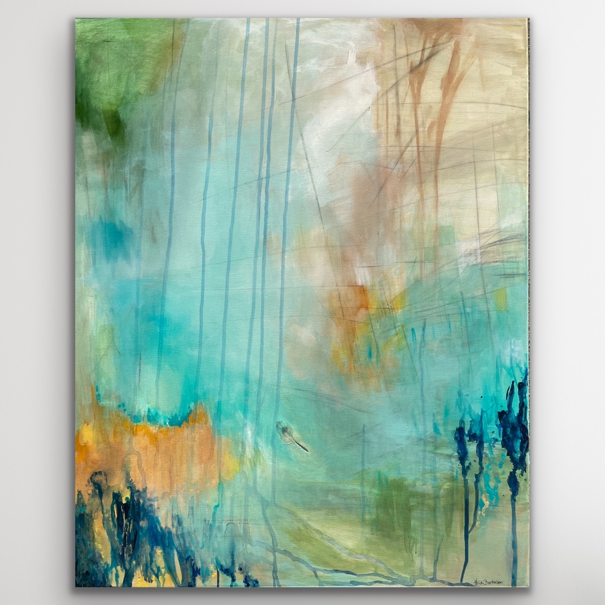 I dette maleri har jeg gemt/malet en rigtig fjer med ind i maleriet. Dette er min måde og sende et budskab ud i verden på, samt at give mine malerier et kendetegn fra mig. Budskabet i fjeren er at minde dig om at du er elsket af din skytsengel, og huske på at sprede god og kærlig energi på din vej.