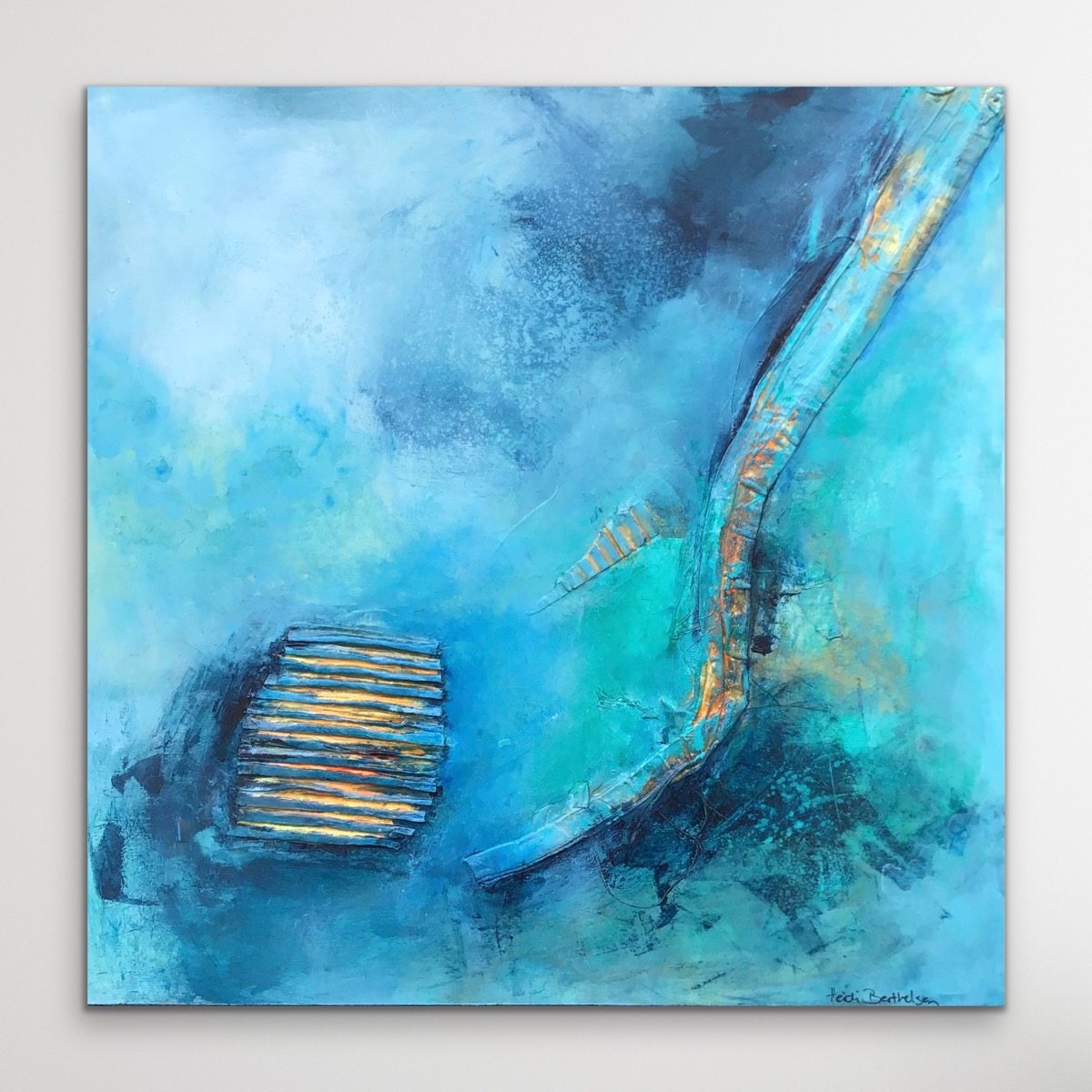 “Indre glød” er malet på en træplade i str.40×40. Malet med mixet media.