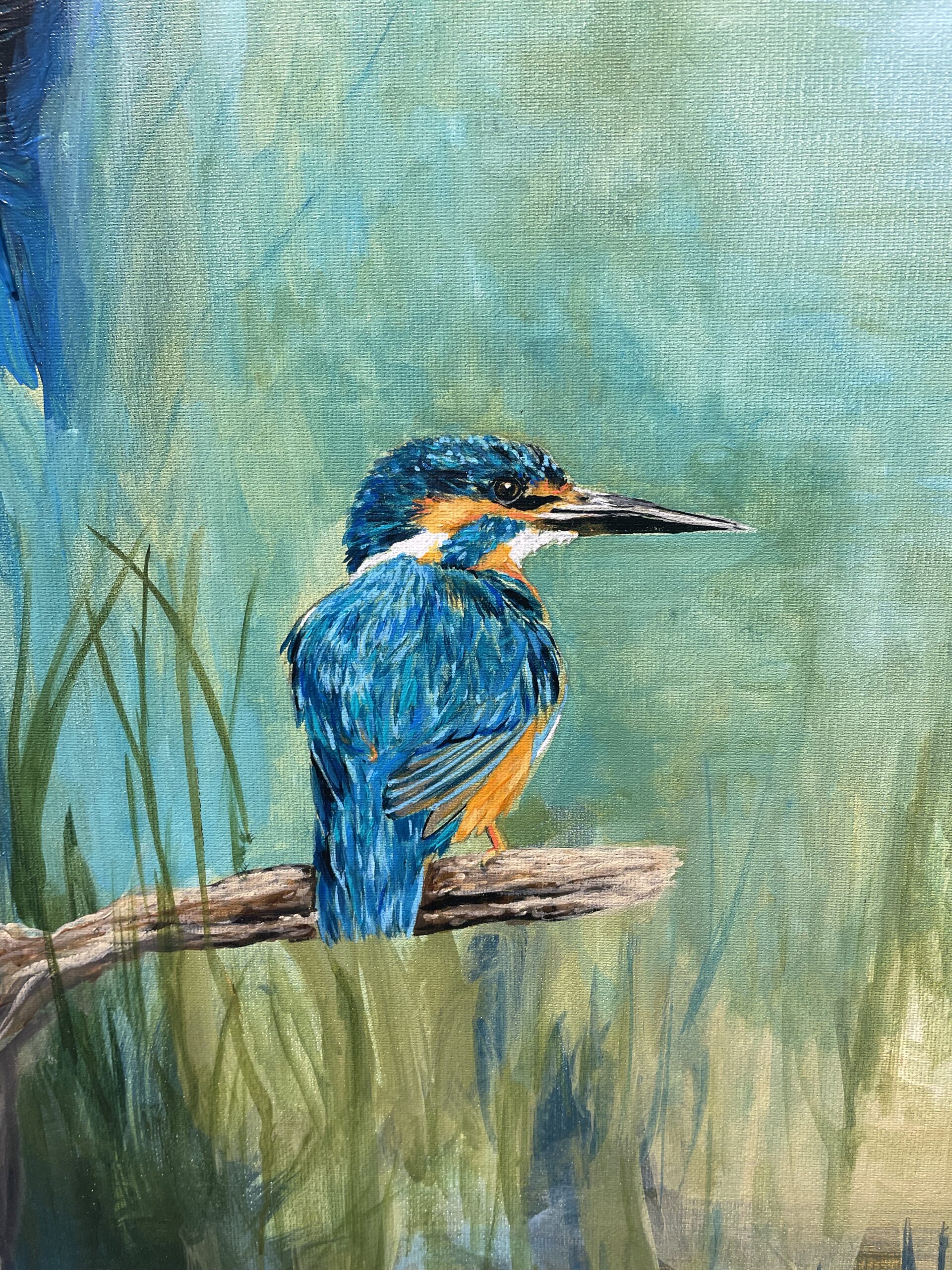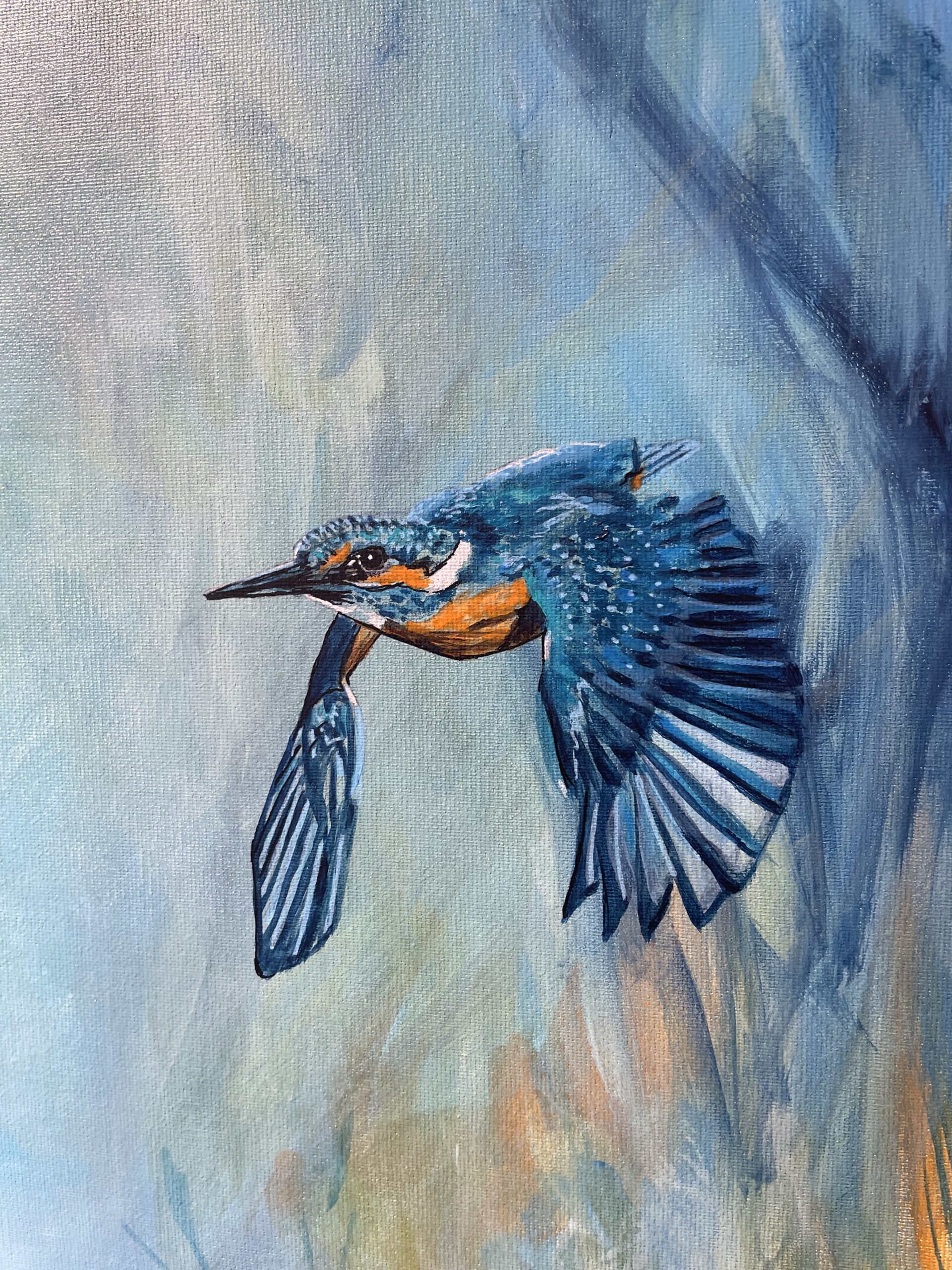 Den lille lynhurtige blå krystal som jeg har malet en del gange. Jeg blive aldrig træt af den lille utrolige smukke fugl med de flotte kontrastfarver. Når man endelig ser den ude i det naturlige element kommer man helt naturligt til at hold vejret, fordi forbløffelsen er så stor at der er den jo et split sekund foran en og væk igen lige så hurtigt som man så den.