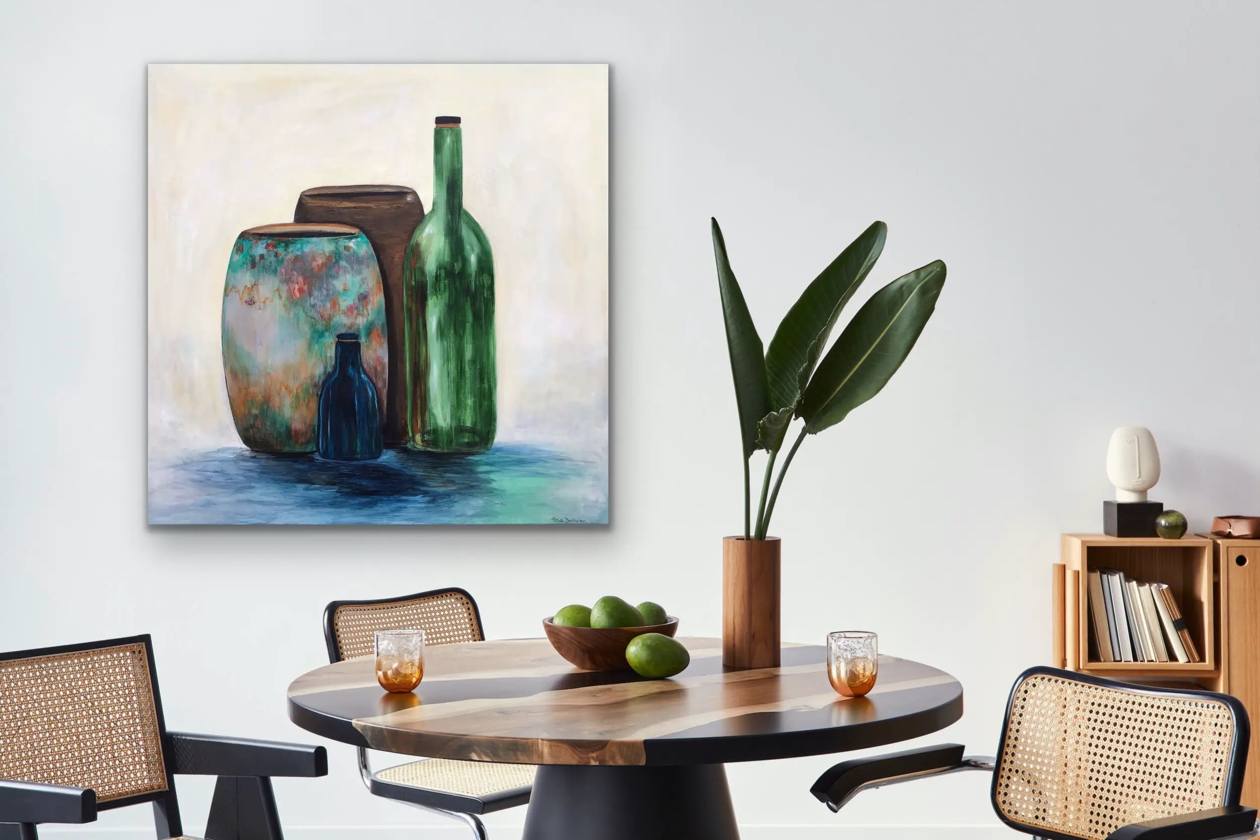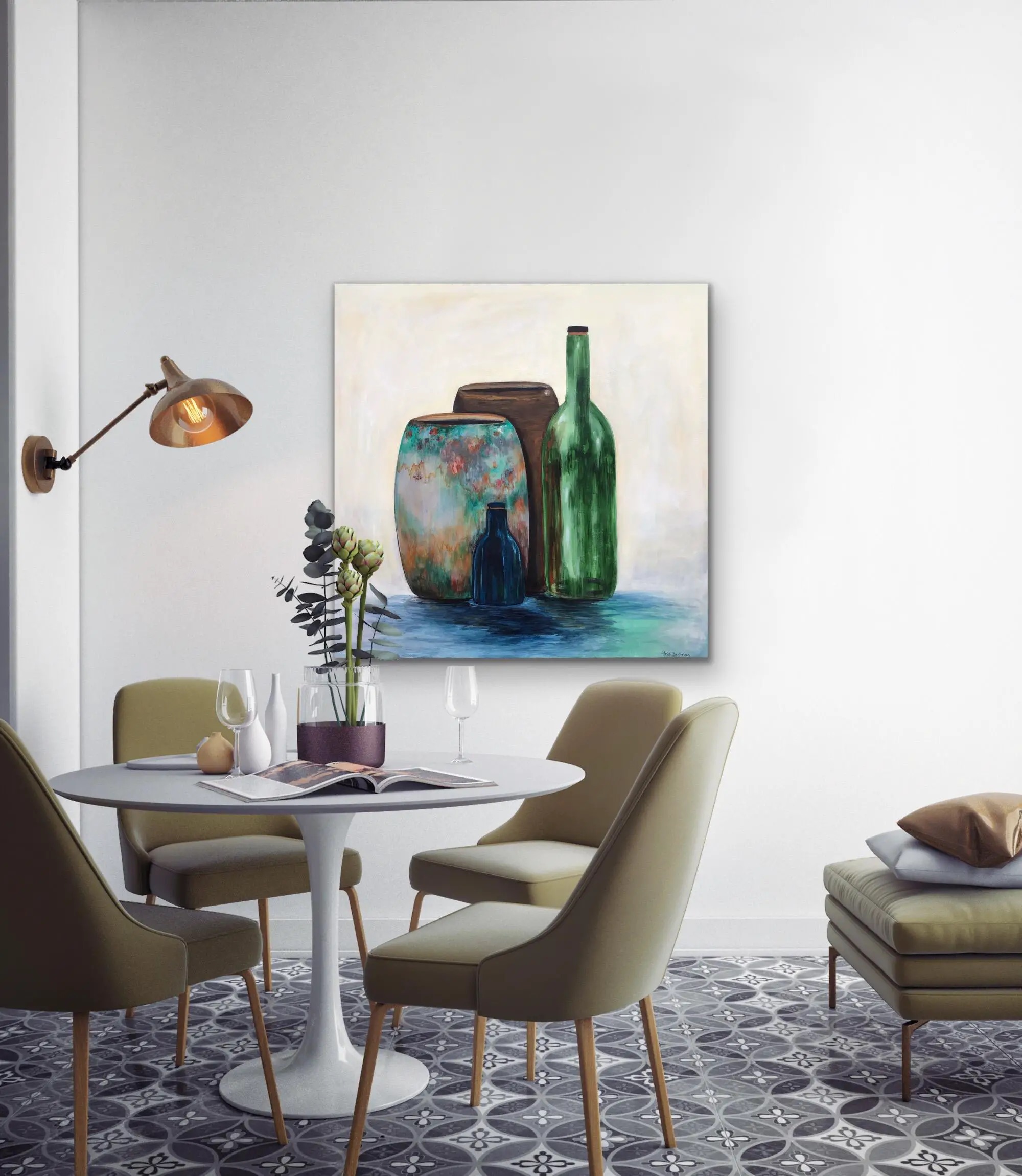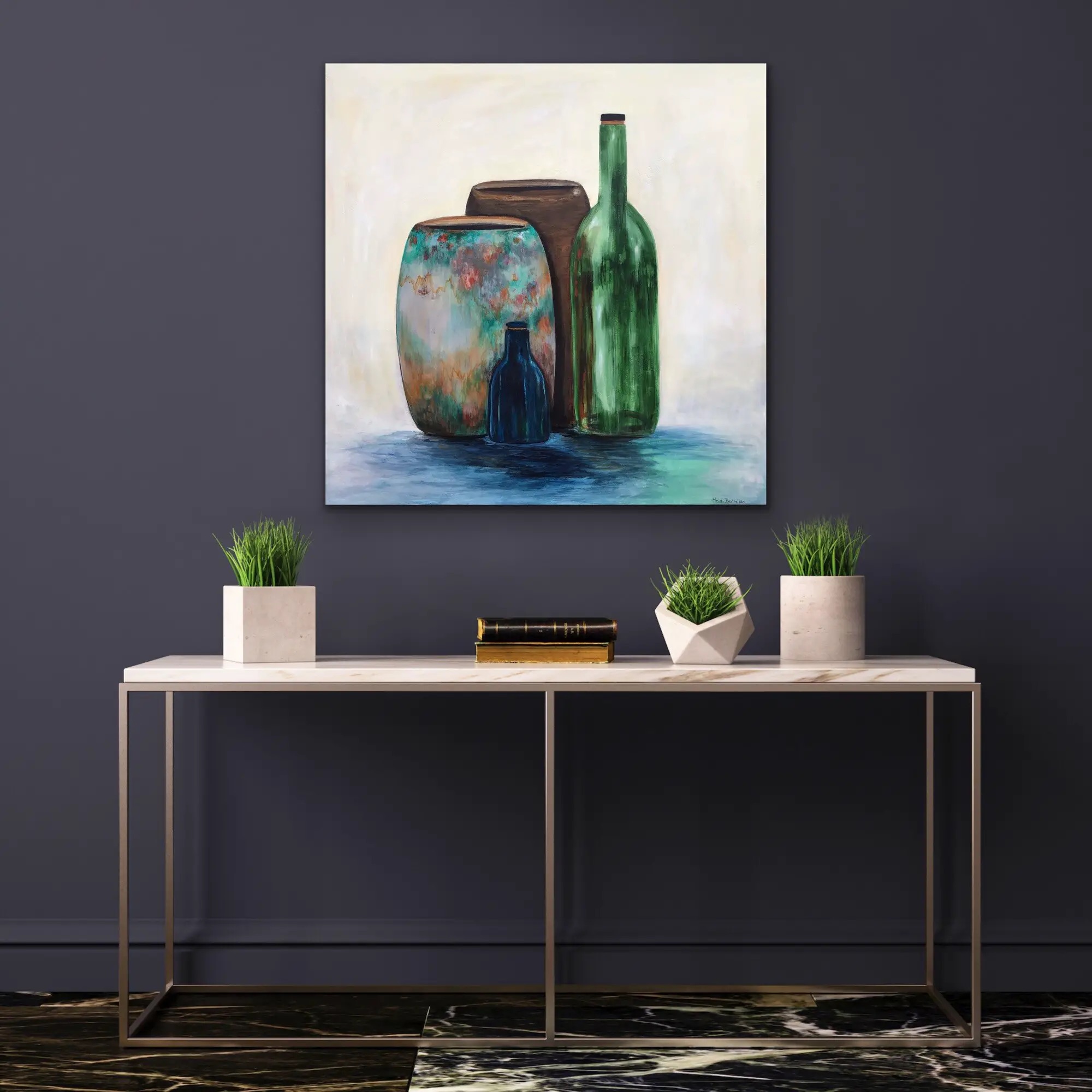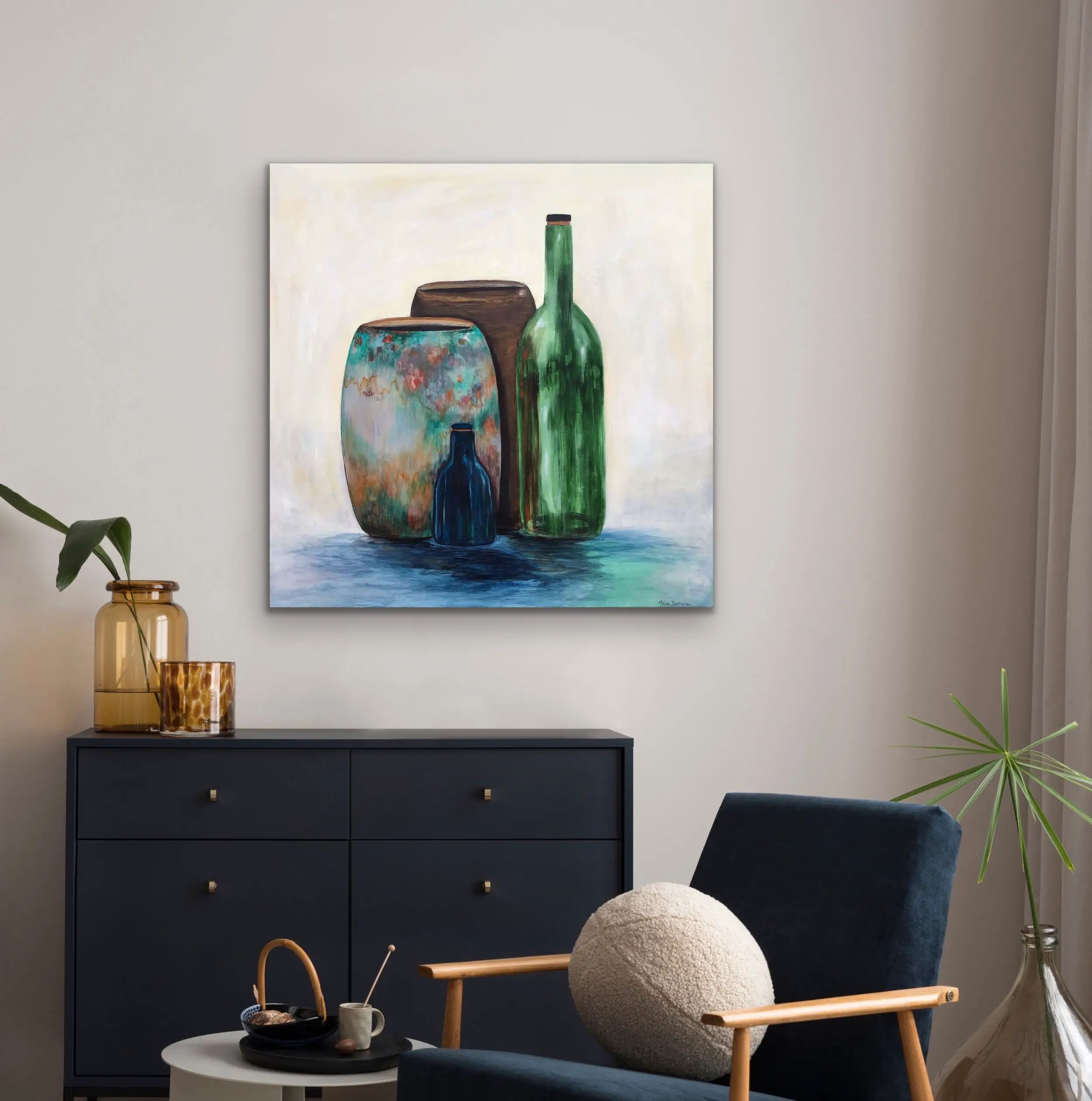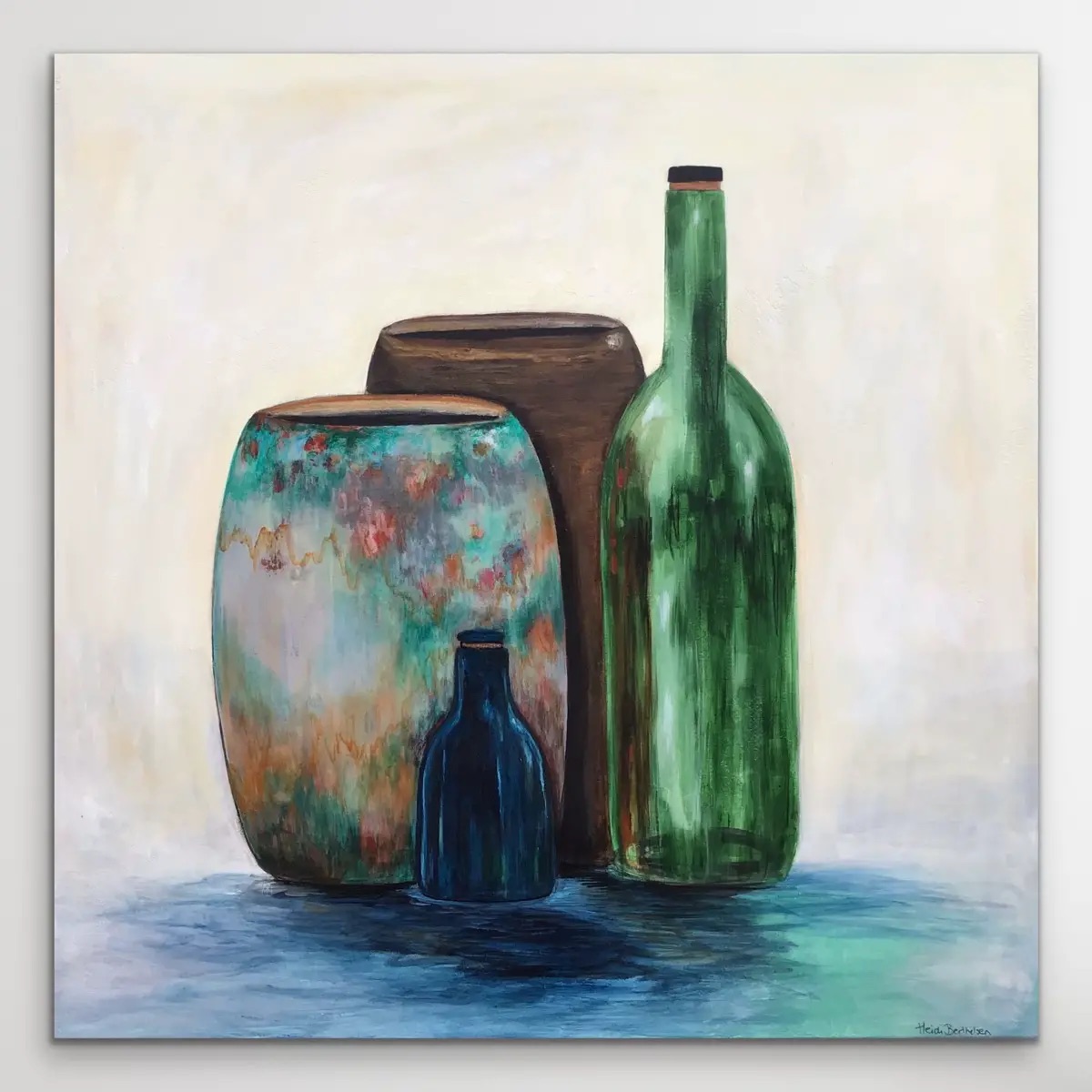 Et smukt unika maleri der lader øjnene vandre og iagttage de enkelte detaljer og farvemønstre. “Livets Forråd” handler om at og samle på alle de gode stunder gennem livet og putte dem på flaske, eller i krukker og ligge dem på lager. En dag kan proppen løsnes og de gode minder vil strømme ud, som kildevand med historier fra den første dråbe og vejen ud til den store flod.