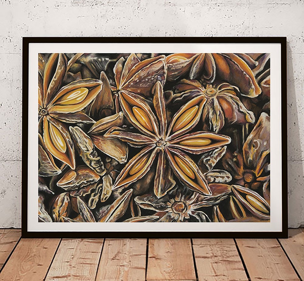 Stjerneanis er indrammet i en sort ramme, hvid passepartout og med refleksfrit plexiglas og måler 40×50 cm.