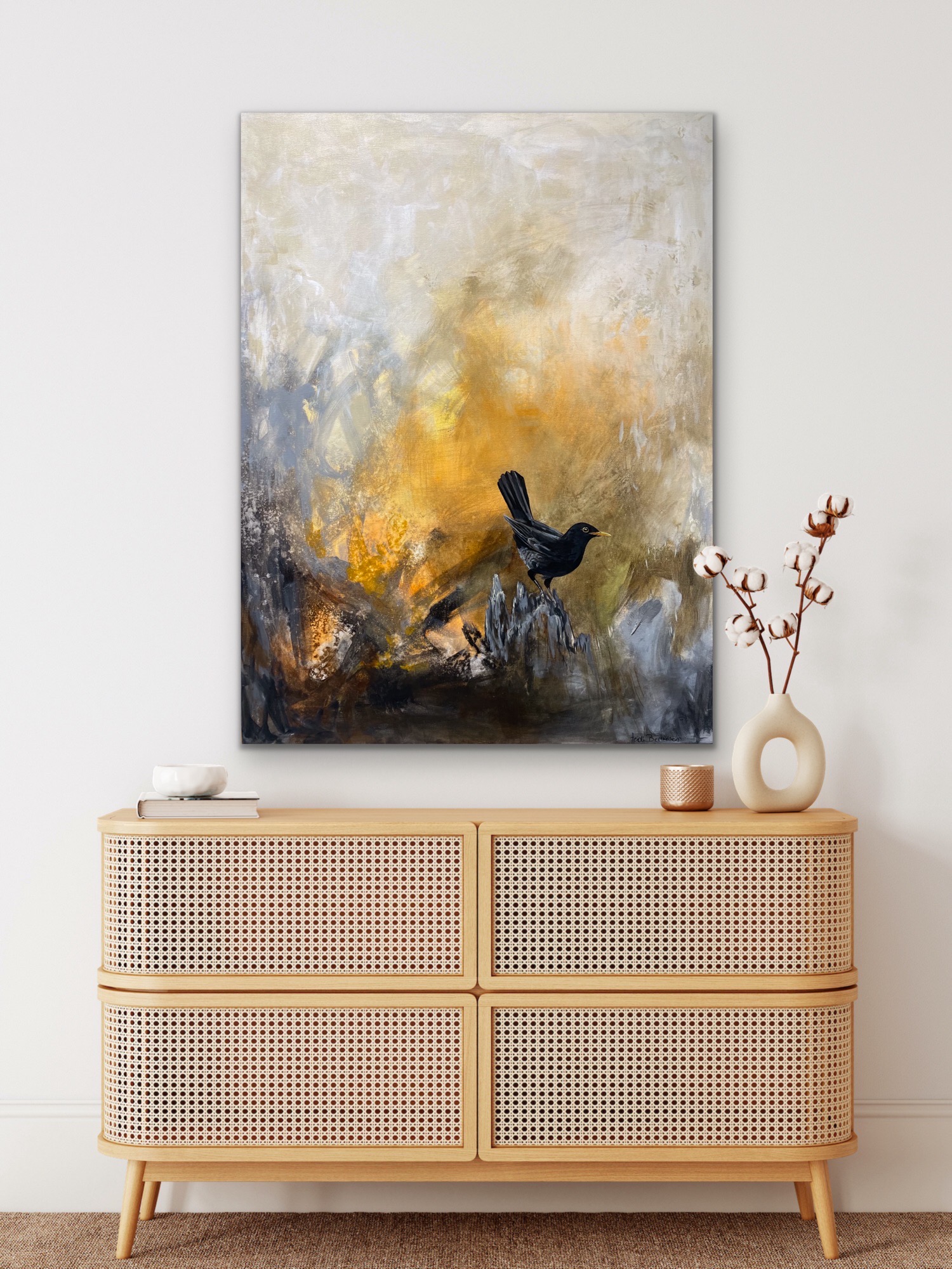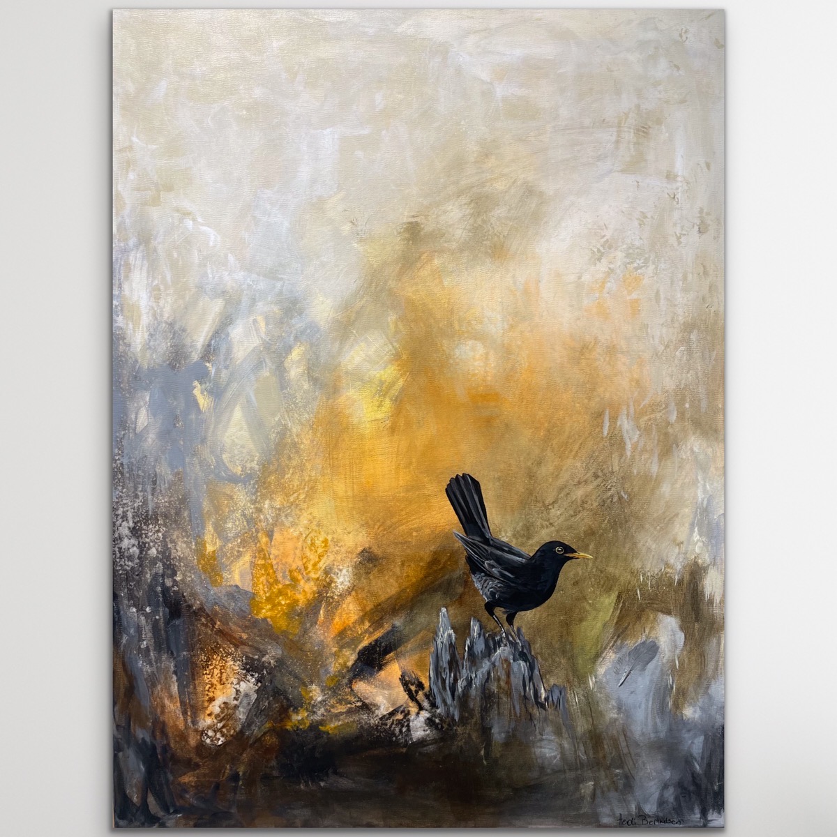 Et smukt unika maleri der lader øjnene vandre og iagttage de enkelte detaljer og farvemønstre. Solsorten for mig er indbegrebet af de første lune sommeraftner hvor den synger de smukkeste sange der går lige ind i sjælen.