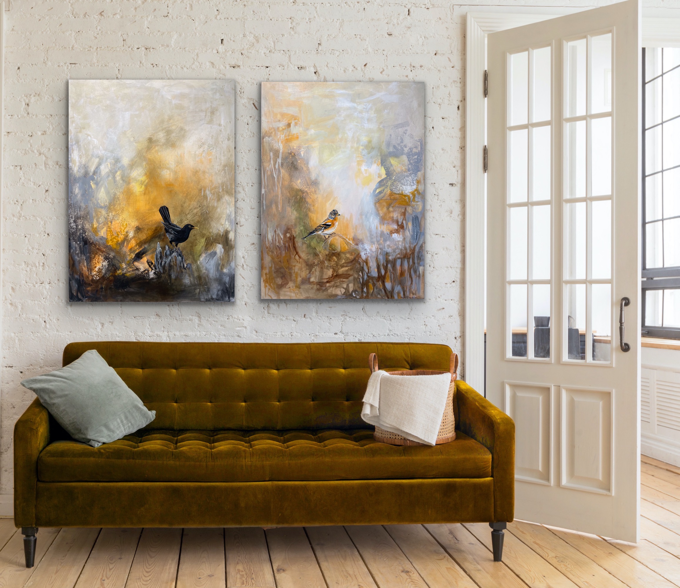I dette maleri har jeg gemt/malet en rigtig fjer med ind i maleriet.
